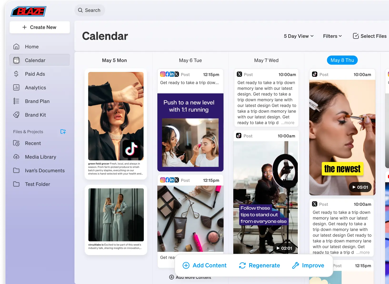 Blaze learns your style to create scroll-stopping videos, ads, and posts that look unmistakably yours.