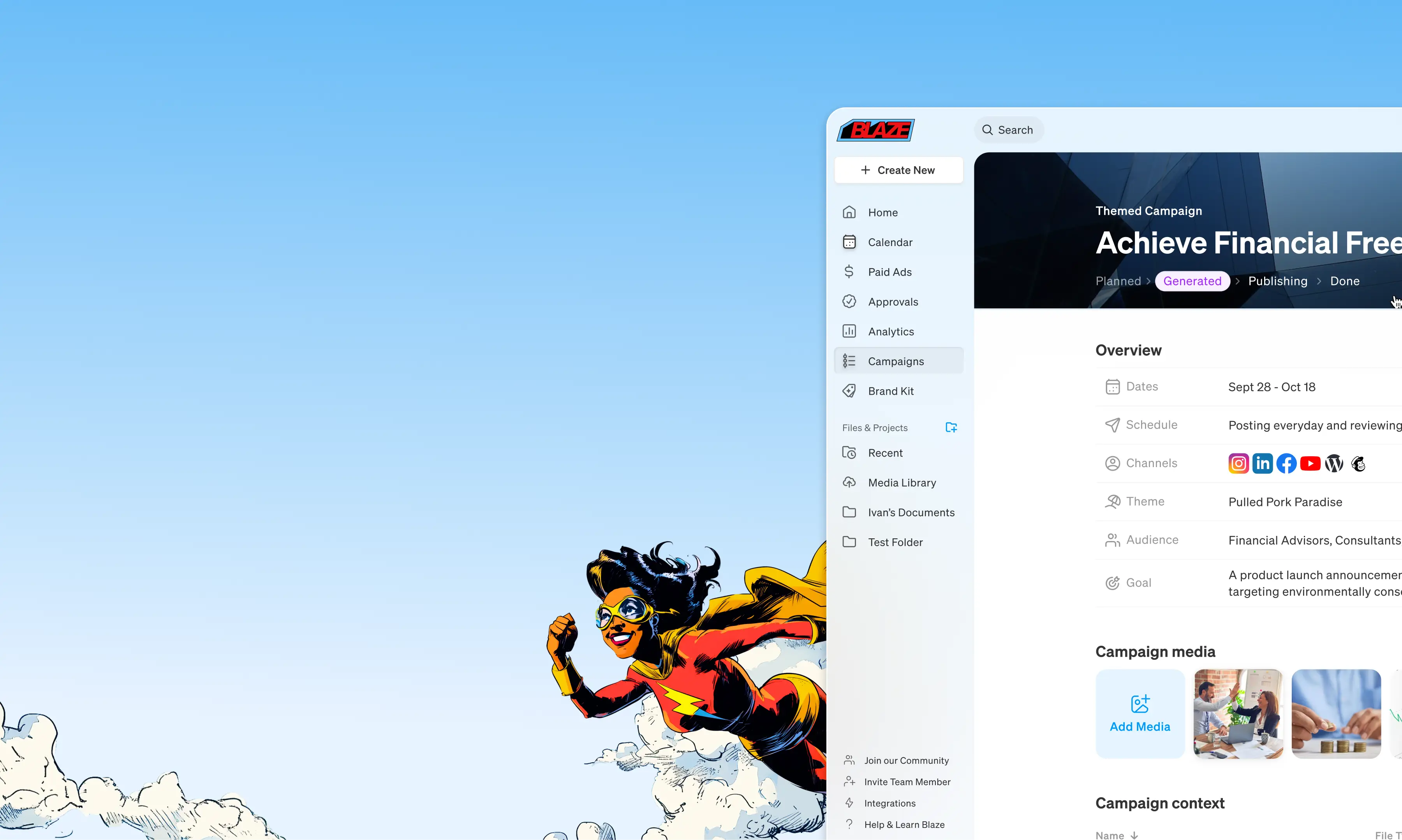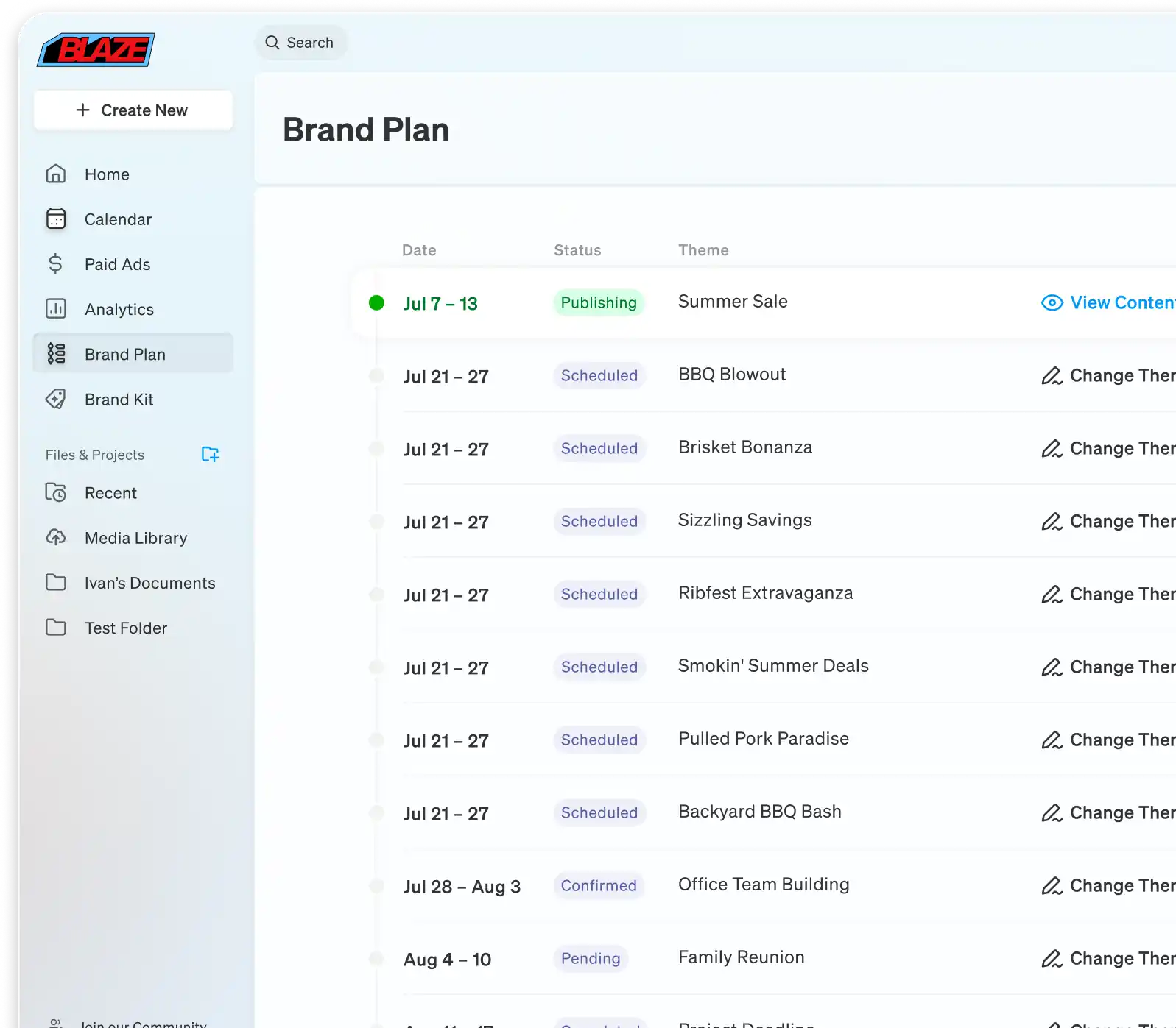 Blaze plans, creates, and posts campaigns across social media, blogs, newsletters, and ads — keeping your marketing calendar full and your brand everywhere.
